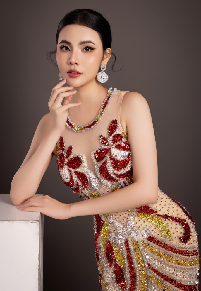 Cô khoe dáng trong mẫu váy dạ hội tông đỏ sang trọng, nữ quyền. Những thiết kế với đính kết pha lê mang đậm dấu ấn phong cách cá nhân của Tommy Nguyễn.