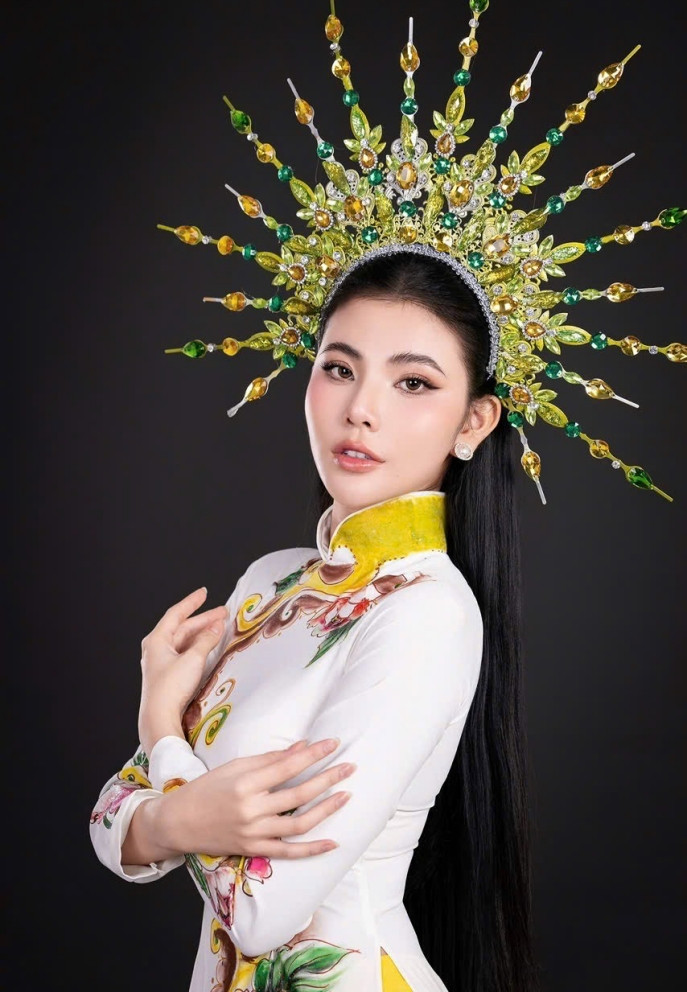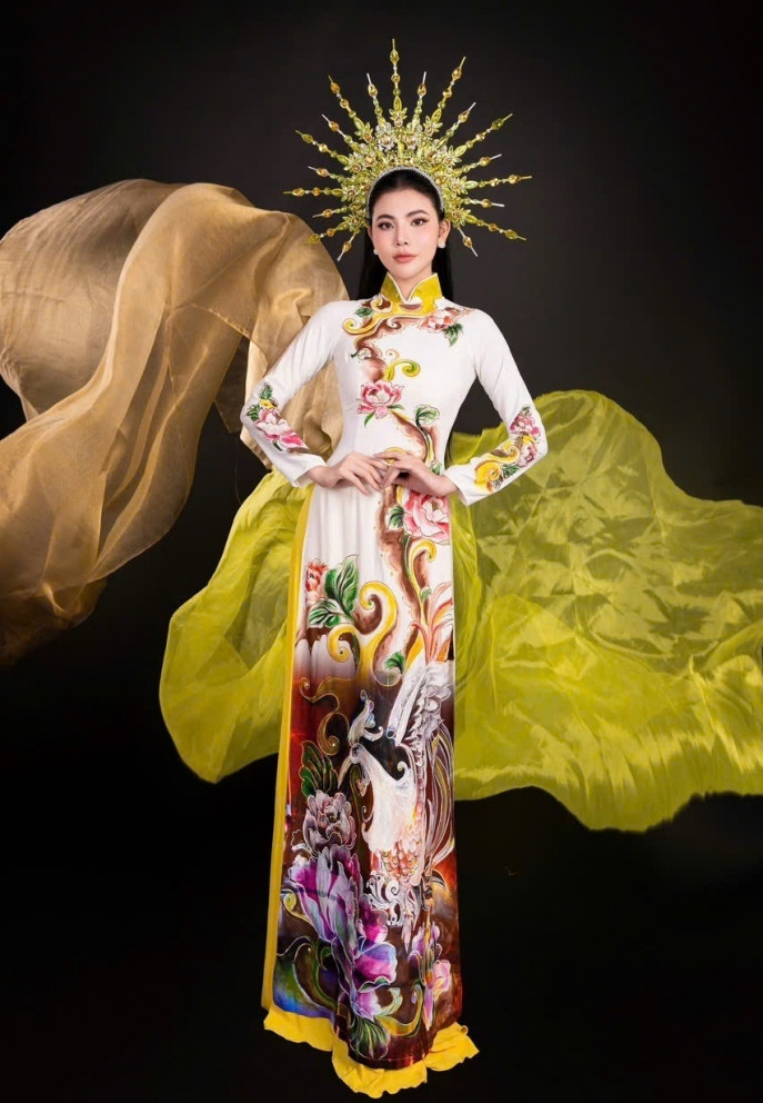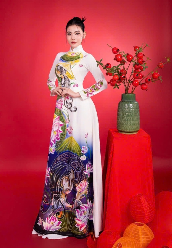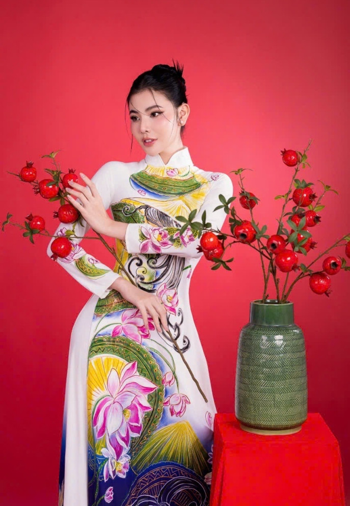 Trong bộ ảnh đón xuân, á hậu duyên dáng trong những thiết kế áo dài vẽ thủ công của NTK.