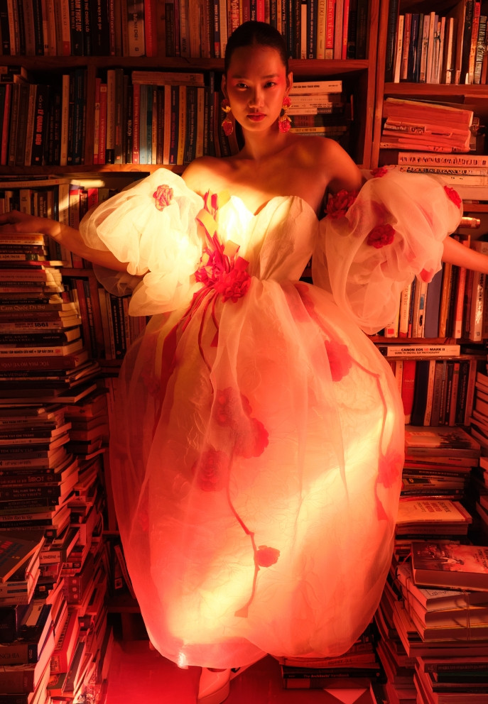 Trong không gian của tiệm sách cũ, 4 người đẹp diện thiết kế đầm trắng tinh khôi điểm hoa đỏ rực rỡ.