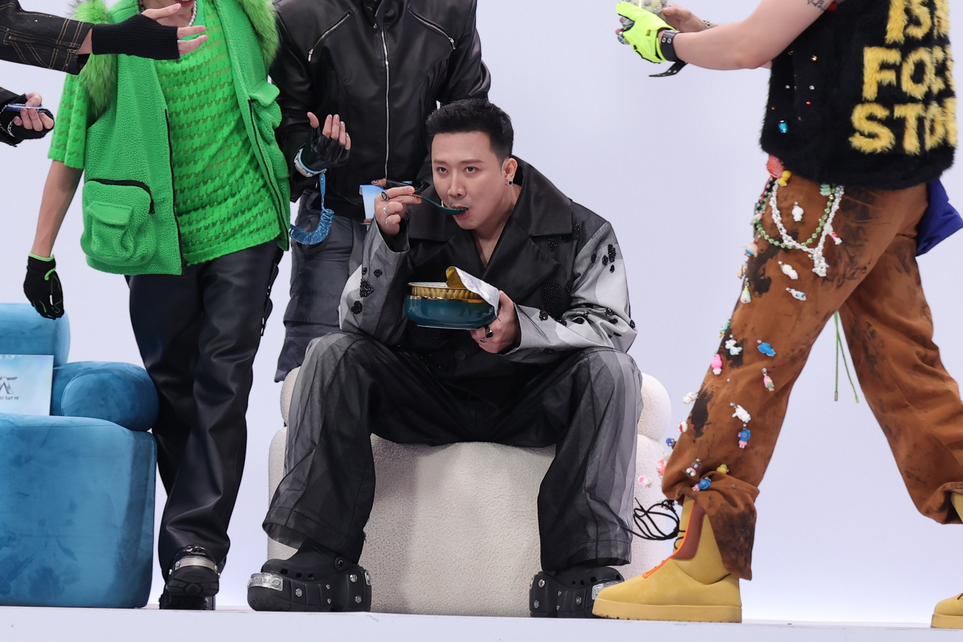 Huấn luyện viên Rap Việt - BigDaddy xuất hiện với xe cub và quầy nước nhân trần. B Ray mang súp bào ngư tặng Trấn Thành.
