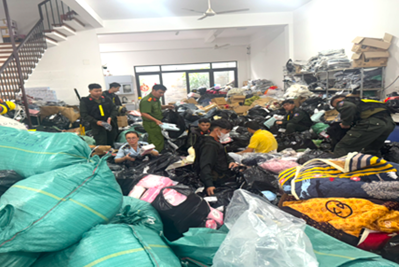 Tại thời điểm kiểm tra, các sản phẩm quần áo, giày, dép, túi, ví cùng hàng loạt mặt hàng là đồ gia dụng, tiêu dùng được chất thành đống nằm la liệt từ khu vực cổng đến kho chứa bên trong nhà ở.