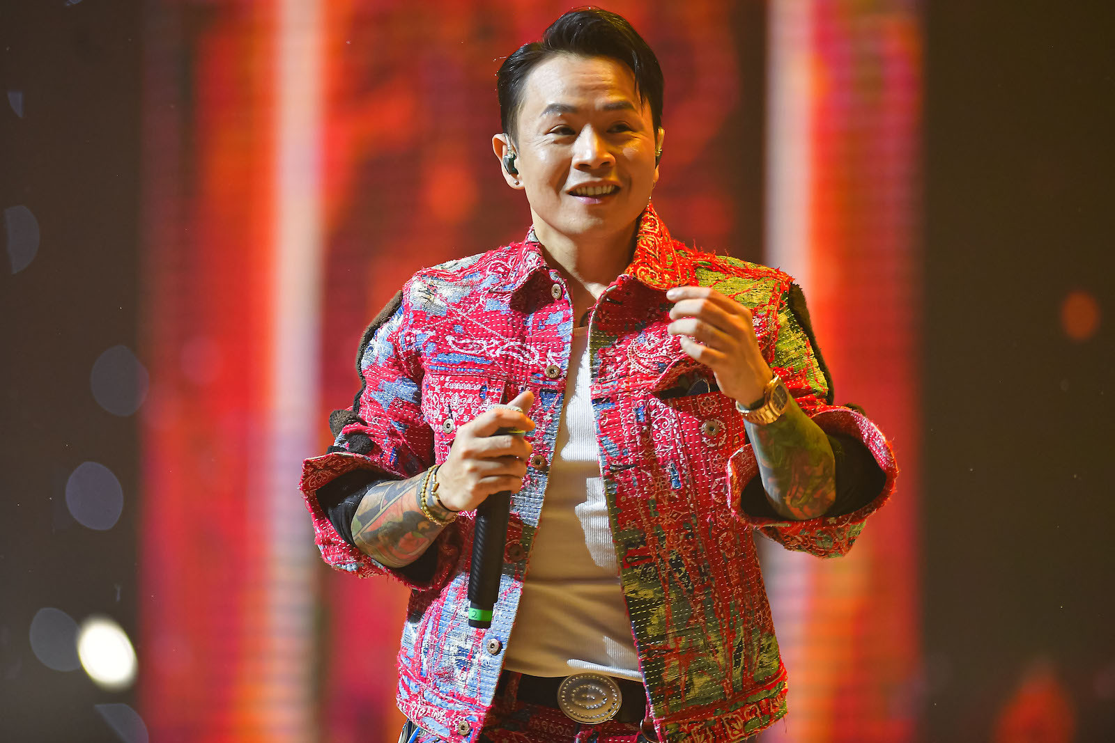 Sự tham gia của Quang Hùng MasterD cũng được khán giả chờ đợi. Diện áo vest đen mix với quần soóc, nam ca sĩ gốc Huế lựa chọn đeo kính đen để xuất hiện với nụ cười tươi và vẫy tay chào khán giả Hà Nội.
